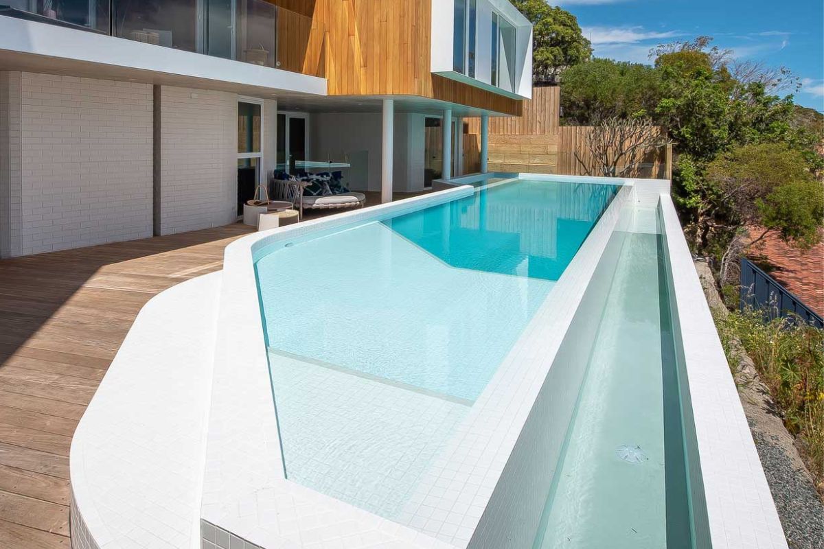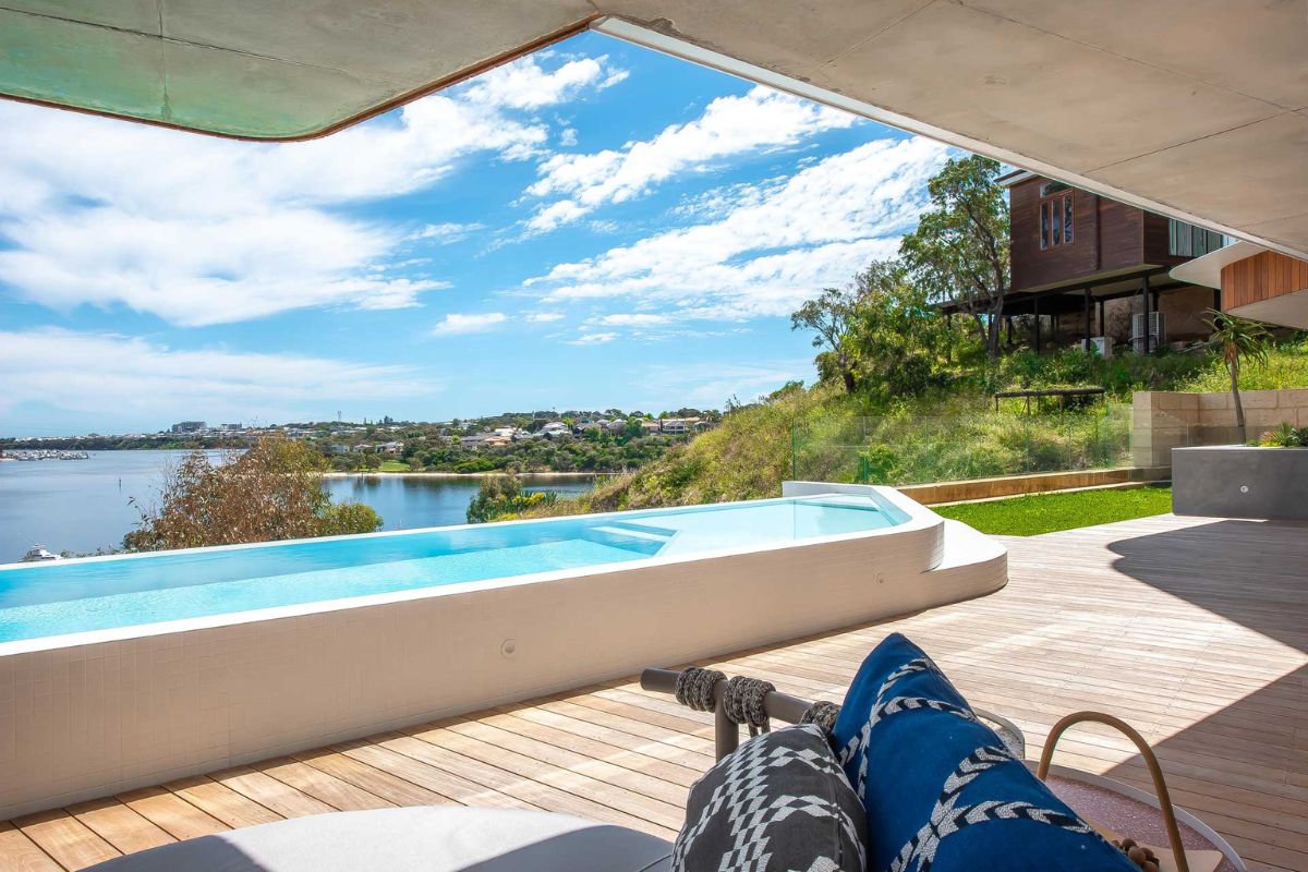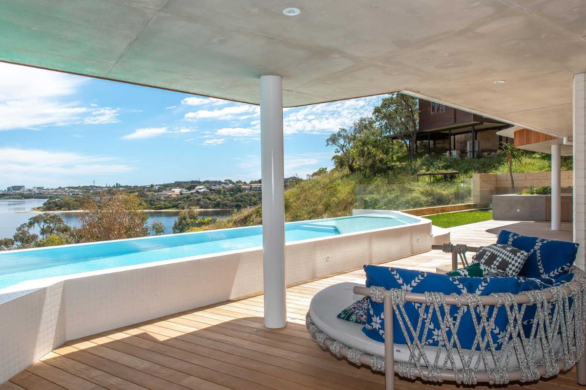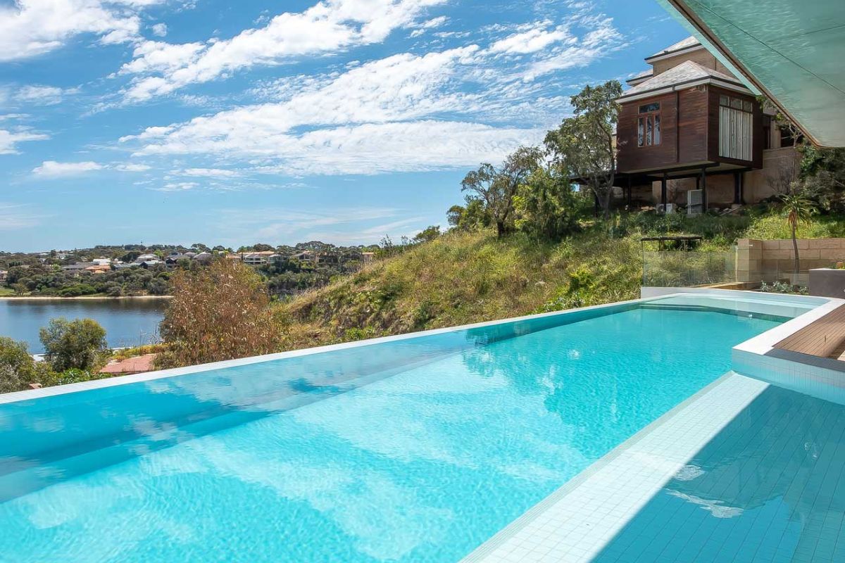 This 16 meter long custom infinity edge concrete lap pool is the new standard for residential pools in Western Australia. Perched high on the limestone hills in Bicton over looking the Swan River this pool has it all! With elegant curves and impeccably detailed tiling, the pool is both aestheticly breath taking and structurally mesmerising. From our multi award winning home @infinityviewsresidence