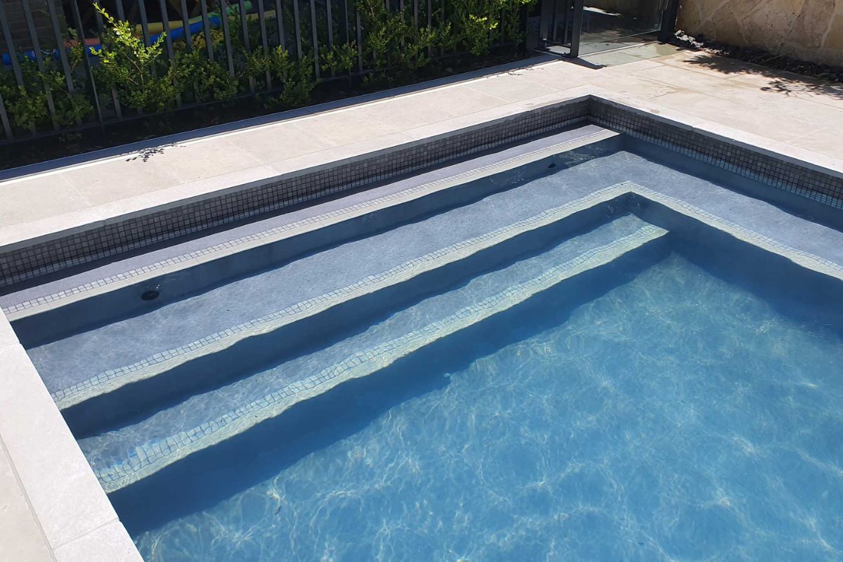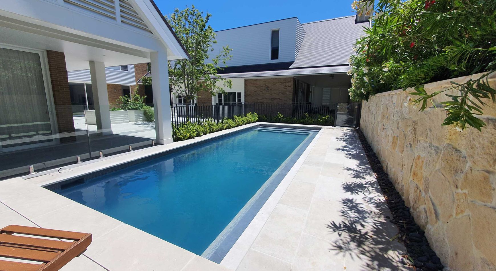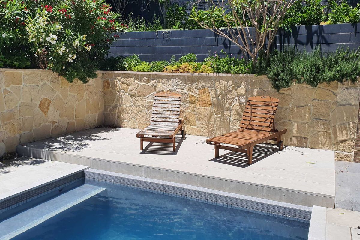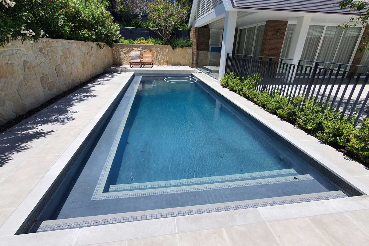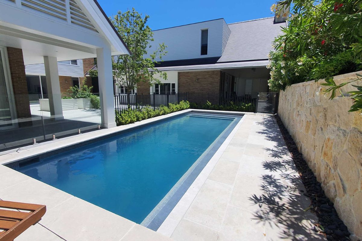 A large Hamptons style home requires a large Hamptons style pool. The pool measures a large 10m x 4m and is surrounded by high limestone clad retaining walls. A large format 800 x 400 grey limestone paver was selected for the concourse and contrasts well with the dark grey pool interior. An Astral saltwater filtration system, water top-up unit and below ground blanket box round out the accessories