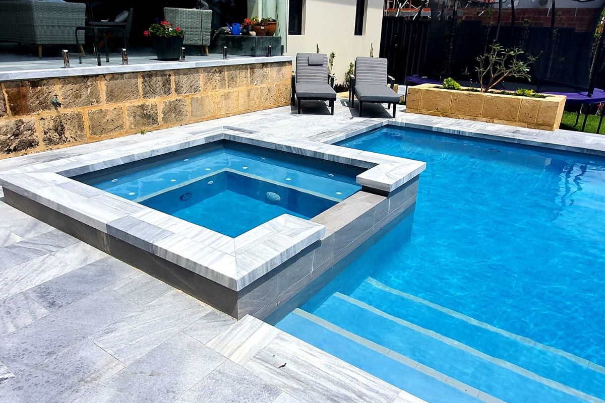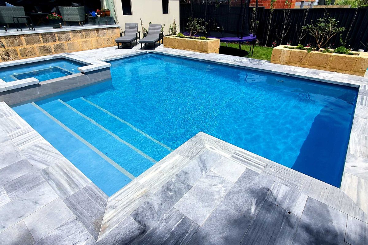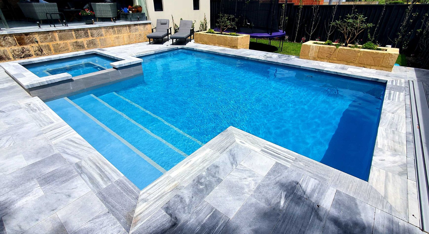 The pool area is paved with Stormstone Granite and a large 300mm x 600mm tile has been used for the waterline of the pool and spa which will mean less maintenance and cleaning for the owners.