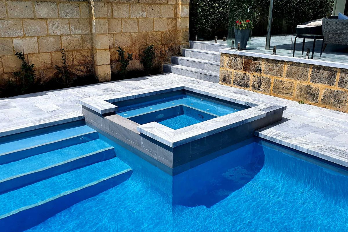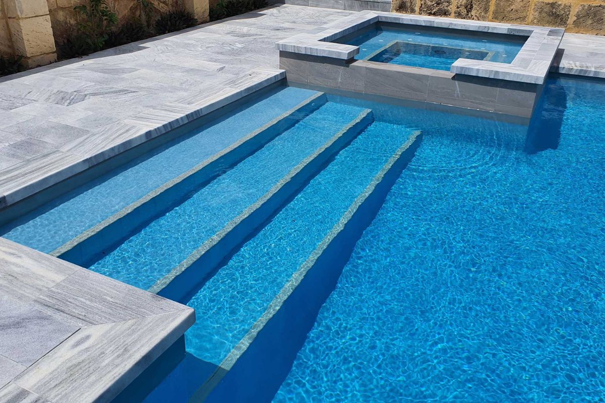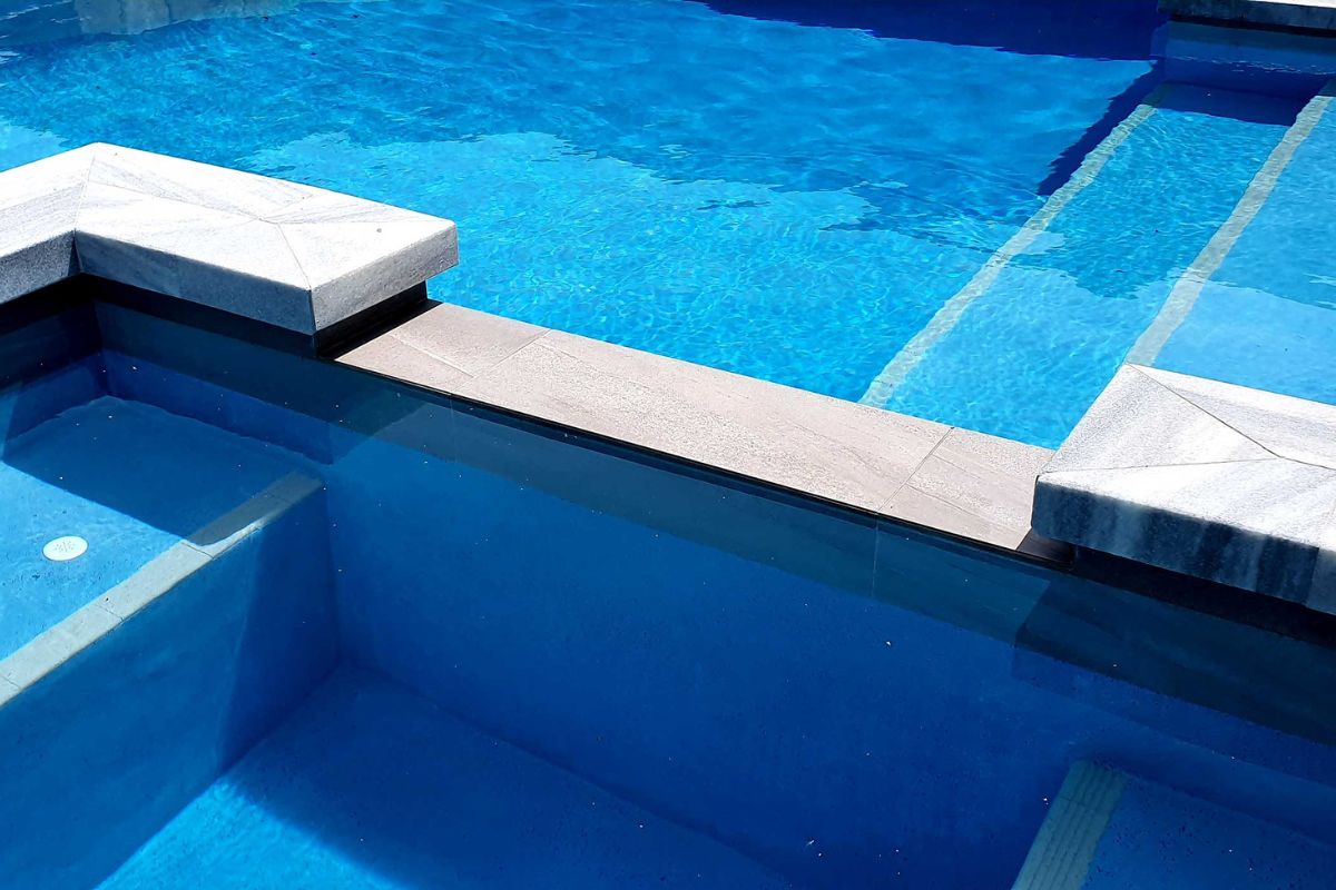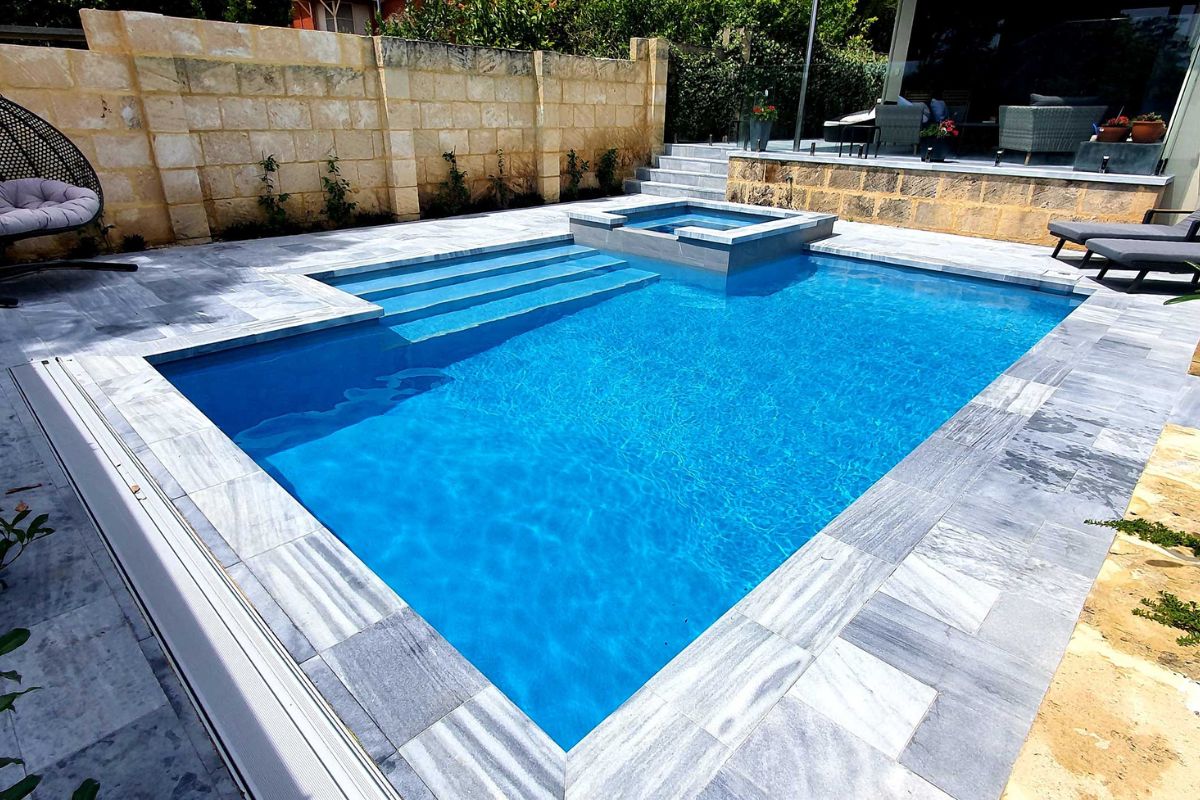 The pool area is paved with Stormstone Granite and a large 300mm x 600mm tile has been used for the waterline of the pool and spa which will mean less maintenance and cleaning for the owners.